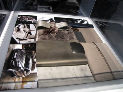 Gondosan összeválogatott színű, mintájú, textúrájú anyagokból készült a koncepcióautó belseje