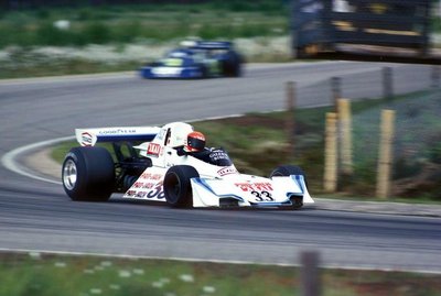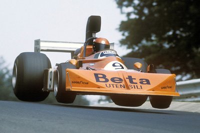 Slick-abroncs extravaganza: Vittorio Brambilla éa a March 751 Ford (1975) a levegőben. Brambilla, az őrült olasz. Villámgyors volt, de törte az autót, mint a ropit. Azonban ha kiadta neki, akkor nyerni is tudott, igaz, csak egyszer, 1975-ben az Österreich