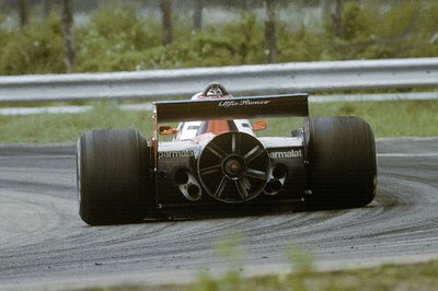Tom Pryce sem volt piskóta, itt is finoman erőcsúsztat a Shadow DN5B-tel (1976). A walesi születésű Pryce villámgyors volt, esőben pedig verhetetlen, annak ellenére, hogy a DN5 nem volt valami jó konstrukció. Egyedüli Forma-1-es győzelmét 74-ben szerezte,