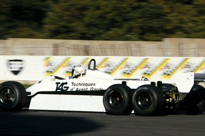 Jodie Scheckter, Tyrrell Ford P34 (1976). Derek Gardner legismertebb autója a hatkerekű Tyrrell. Az alapötlet szerint a két pár tízcollos kerék sokkal kisebb homlokfelülettel rendelkezett, mint az akkoriban használt nagyobb kerekek, ezen felül nagyobb ter