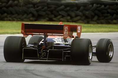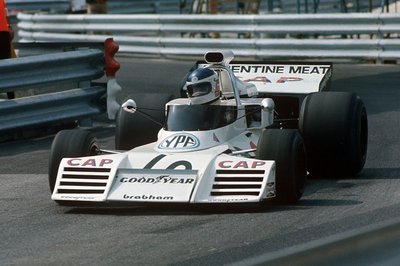 Jellegzetes Brabham-dizájn. Carlos Reutemann, Brabham BT42 Ford (1973). A furcsa első légterelővel szerelt autóval három győzelmet könyvelhetett el 74-ben (a 73-as szezon felétől használták a típust), de az iszonyatosan erős mezőnyben ez csak a hatodik he