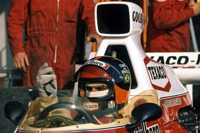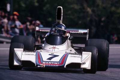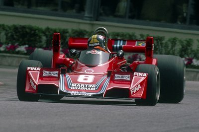 Carlos Pace kilinccsel előre (lol) a Brabham Ford BT44 (1974)-ben. Gordon Murray autói már akkor is magukon viselték a letisztult, aerodinamikailag nagyon fejlett karosszériák stílusjegyeit. A brazil Carlos Pace, aki Wilson és Emerson Fittipaldi jó barátj