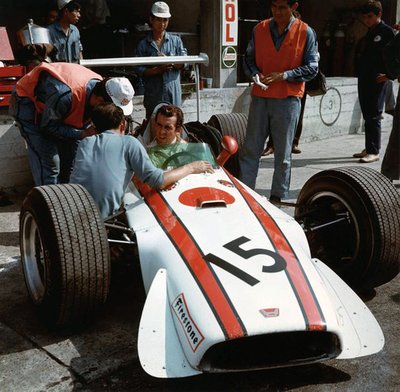 Brabham BT26 Ford, a magassági (?) kormánynál Piers Courage. A Courage-dinasztia híres sörfőző család volt, Piers pedig igazán ügyes versenyző, hiszen a gyenge Brabhammel is második lett Monacóban és Watkins Glenben. 1970-ben vesztette életét Zandvoortban