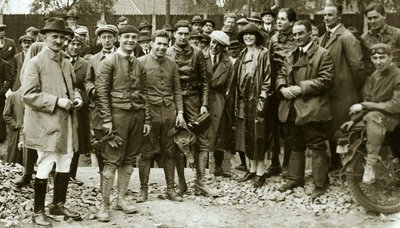 Az 500-as Majláth-Triumph nyergében az olasz Giovanni Cocchival vívott meghívásos motorverseny után az UTE stadionban 1926 nyarán (Fotó: AMS)
