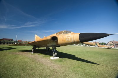 Az egyetlen kakukktojás, a Svédországból származó J-35 Draken. A második generációs szuperszonikus vadászgépek közül az egyik legérdekesebb - és egyik legszebb - konstrukció kettős nyilazású deltaszárnyaival. Egészen a 90-es évekig használták. Sajnos a k