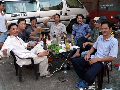 Szieszta ebédidőben, a járda közepén, Ho Si Minh-város kínai negyedében. A forró leves után jólesik a hideg sör a nagy melegben, és még jobban az európai turistával való évődés. Aki állja a tréfálkozást, amiből szerencsére egy szót sem ért, annak kijár eg