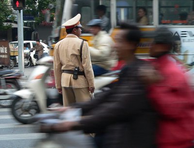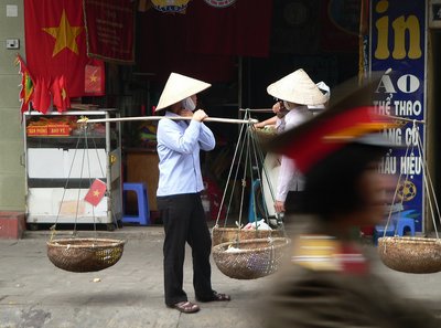 Mozgóárusok Hanoi belvárosában. Bár a gazdaságban egyre nő a külföldi befektetők és a helyi magánvállalkozók szerepe, a politikában a Vietnami Kommunista Párt szilárdan őrzi pozícióit. A vietnami zászló piros-arany színe nemcsak a kommunista berendezést j
