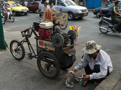 Nemcsak a divatozást, de a munkát is szolgálják a háromkerekű járgányok: ezzel a triciklivel például a vándorköszörűs járja Saigon negyedeit, és a hatalmas városban mindig talál éleznivalót. Direkthajtás és barkácsolt V-fék: a mobilizált köszörűvel kemény