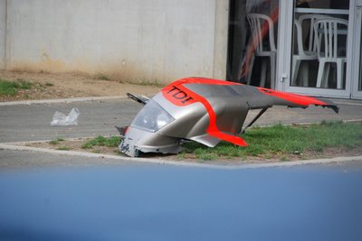 Pista jól tippelte. Mezei műszaki hiba miatt kiesett autót nem takarnak le ennyire. A lengőkar bekötésénél repedt meg a karosszéria