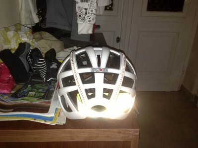 A Casco sisak, friss beszerzés, rajta a fényvisszaverő szalag