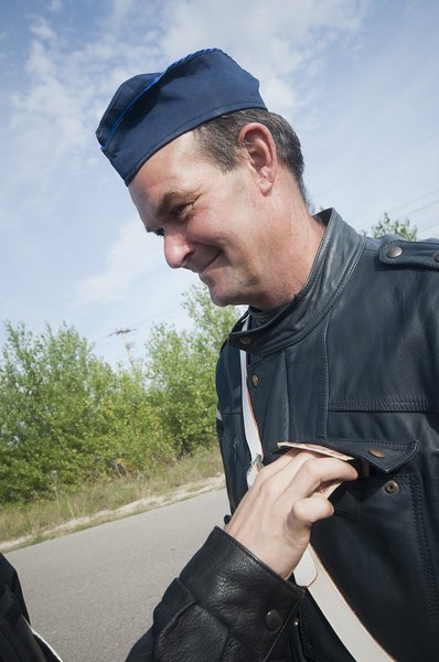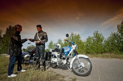 Schmidt László eredeti rendőrségi bőrruhában motorozik