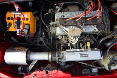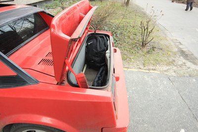 Az első csomagtartót teljesen betölti a pótkerék, de a hátsó is csak jelzésértékű...a fedél már nem bírta el a saját súlyát, de segített a seprű.