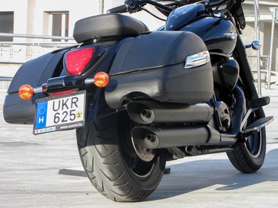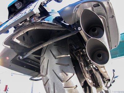 Nagy kipufogó dobok a táska alatt. Nyeregben ülve egyáltalán nem szép a hangja, mint ha diszperites vödörrel a fejemen próbálnék csopper-hangot utánozni