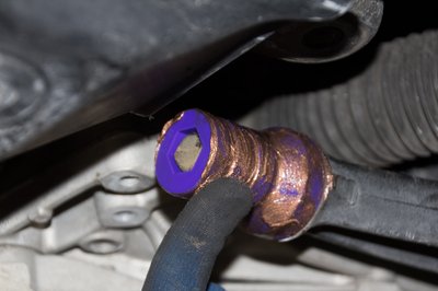 A középső rozsdamentes acél cső elfordul a lila poliuretánban, a vascső a gumiban nem