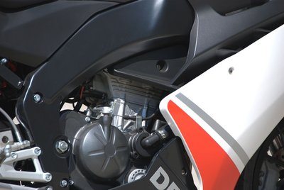 A vázra csavart fekete műanyaglap eltakarja, hogy valójában milyen kicsi a motor
