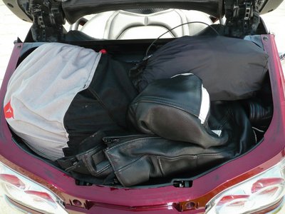 A felső doboz meglepően öblös: egy bőrdzseki, egy integrált bukó és egy esőruha - csont nélkül