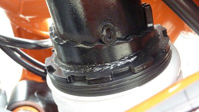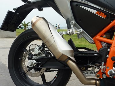 Az előző Duke kipufogója még elfért a blokk alatt. Az új viszont teljesíti az Euro V normát, így a katalizátor kiszorította a helyéről végdobot