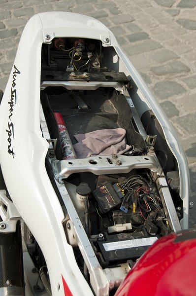 A hűtővíz kiegyenlítő tartály is itt kapott helyet, plusz a hátsó ülés alatt némi raktér szerszámoknak, láncspray-nek