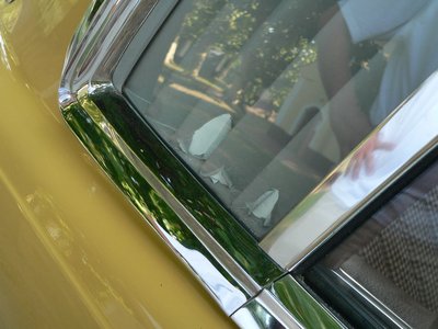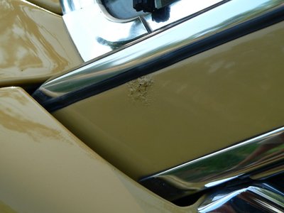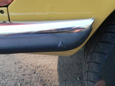 Sérülés az első lökhárító gumicsíkján. Harmincöt év alatt szinte elkerülhetetlen. Ugyanitt látszik, hogy dolgozik a rozsda a festék alatt az oldallemezen