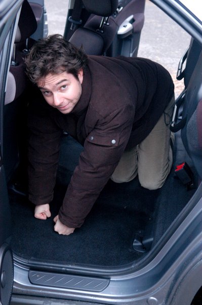 Szerző mint kutya a felhajtott ülés alatt