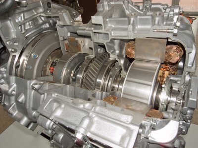 Belső csillapítós lendkerék (hogy a benzinmotor vibrációi ne jussanak tovább), önindító-generátor, bolygómű, villanymotor