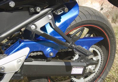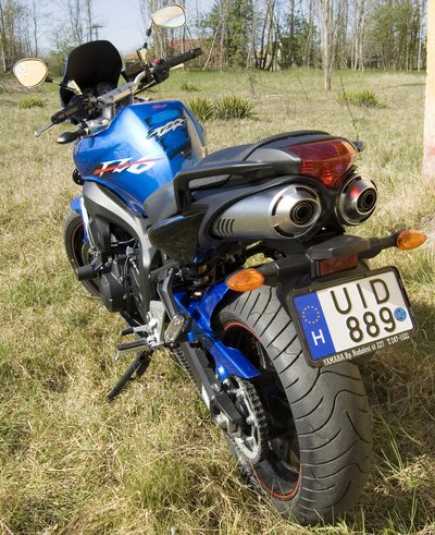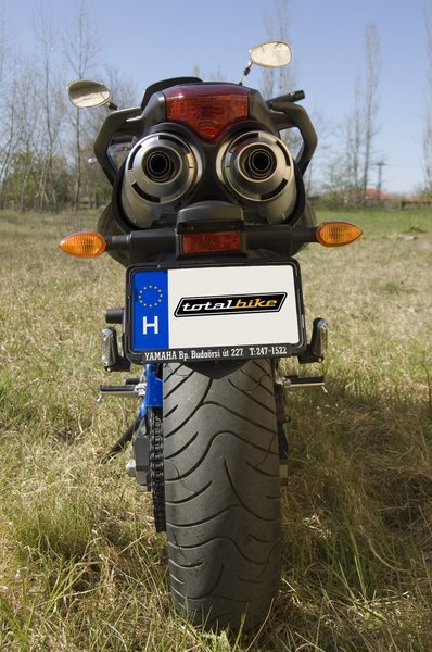FZ6 S2 hátulról: dupla kipufogó-kivezetés és 180/55-ös Bridgestone