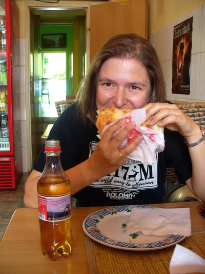 Kati mosolyog, de engem már valami óriási, hússal töltött kebabnak néz
