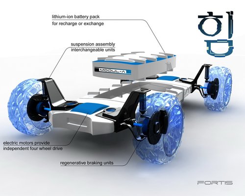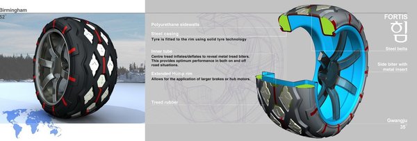 A Fortis legszellemesebb újítása azonban akár hagyományos, benzinmotoros terepjárókon is jól működhet. A tanulmányhoz olyan terepgumikat terveztek, amelyeknek a felületén vékony acéllapocskákat helyeztek el a mintázat mélyebb részein. Ezek csak akkor tudnak kiemelkedni az abroncs felületéből, ha a gumi nyomását csökkentik, és ezzel a talajjal érintkező részen a gumi belapulhat. Így egyrészt nagyobb felület érintkezhet a talajjal, ami terepen egyébként is jó módszer az elakadás veszélyének csökkentésére, másrészt az acéllapok ilyenkor a talajba kapaszkodnak, ezzel is segítve a továbbhaladást. Ugyanakkor a nyomást növelve befeszülnek a nekik kialakított fészekbe, így épített úton sem okoznak felesleges zajt, és nem is roncsolják az útburkolatot.
