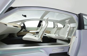 A Skydeck ránézésre nem túl érdekes darab, egybeszabott ötajtós üvegtetővel – láttunk már ilyet tanulmányként és sorozatgyártmányként is épp eleget – de az ajtók kinyitásától kezdve határozottan érdekessé válik. A négy oldalajtó közül egy sem foglal nagy helyet széltében, kinyitott állapotban sem: a két első felfelé nyílik, mint a Lamborghiniken, a hátsók pedig lefelé-hátra csúsztathatók a karosszériával párhuzamosan. A B oszlop hiányzik, így egy-egy oldalon a két oldalajtó egy-egy hatalmas nyílást takar, de ez még nem minden: a hátsó ajtók alsó peremét lépcsősen képezték ki, így még egyszerűbb a beszállás.