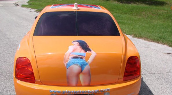 Valószínűleg ilyen autóval járnának a Duke fivérek, ha megnyernék a lottóötöst. Tessék kapaszkodni: itt egy Bentely konföderációs zászlóval, és Daisy Duke kerek fenekével.