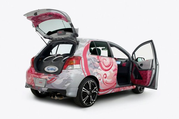 A Toyota is megpróbál feltűnést generálni a SEMA Show-n, ami nem könnyű az egyedi prototípusok – hot-rodok, versenyautók, low-riderek – között, különösen egy egyszerű Toyota Yarisszal. A megoldás: a legtöbb érzékszervet stimulálni. A pink mintás festés csak az egyik komponens – ezzel világlik ki a tömegből – a másik a csomagtartóba szerelt tripla Alpine mélynyomó, amellyel – legalábbis a látvány ezt sejteti – bármelyik konkurens tuningautó percek alatt lefújható a színről.