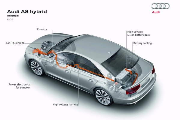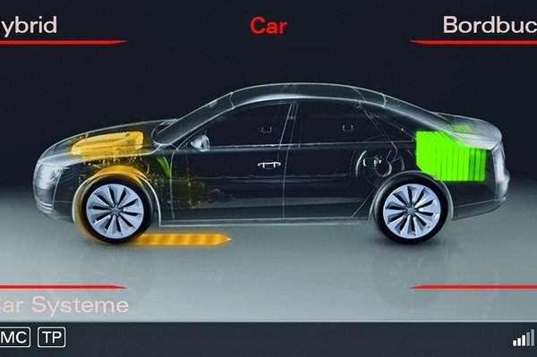 A hibrid egyetlen kézzelfogható hátránya a többi változathoz képest a kisebb csomagtartó: a Li-ion akkucsomag 110 litert vesz el a hasznosítható térből, így a poggyász számára 400 liter marad. Cserébe csúcsforgalomban gyakorlatilag nem fogyaszt benzint az autó, hiszen két kilométert 65 km/h alatti sebességgel tisztán elektromos üzemben is elmegy, araszolás közben talán többet is. Belülről nincs sok különbség a hibrid és a többi A8-as változat között, csupán néhány eltérő beltéri díszítőelem és a műszerfali kijelzőn megjelenő energiaáramlási diagramm – Audiul Powermeter – jelzi, hogy nem csak belső égésű motor mozgatja az autót.