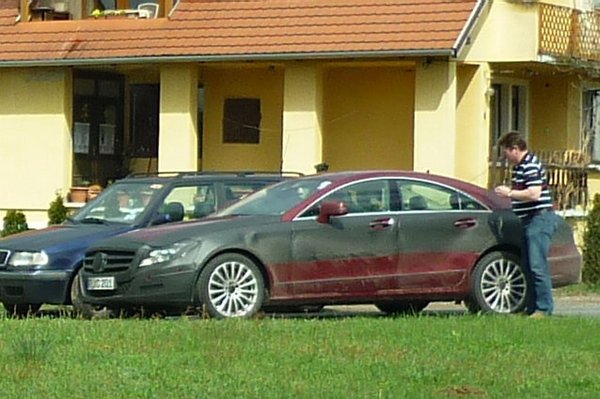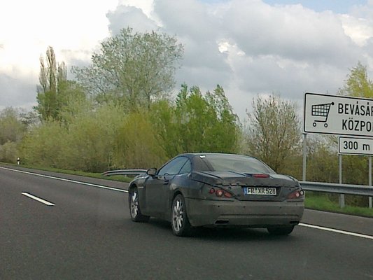 Tisztelt Winkler Róbert! Ma délután az M7-en Bp. felé autózva előztem meg egy BB kezdőbetűs német rendszámú Sprinterből és S-Klassékból álló, felantennázott, Mercedes polós emberekkel teli konvojt, amelynek az első autója egy, a csatolt fotókon látható, álcázott Mercedes kupé volt. Kb. a jelenlegi SL méretével egyező. 1 km-rel később pedig egy kb. SLK méretű szintén agyonálcázott kupét előztem meg. Sajnos egyedül voltam, ezért csak ezt a két képet tudtam menet közben készíteni. Gondoltam, hátha érdekes a kép, ezért küldöm Önöknek. Üdvözlettel, Hajdú Tamás
