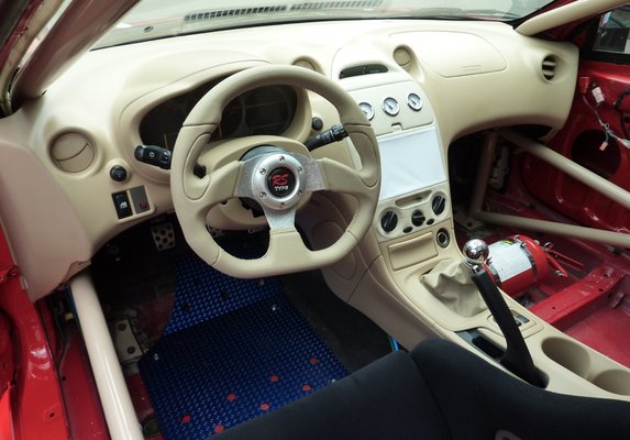 A Toyota sajnos nem kelt olyan benyomást, mintha komoly ellenfél lenne. Lehet, hogy csak még nem készült el, de az inkább csinos, mint masszív alufelnik alatt még szériának tűnő fékek virítanak. Ezek állítólag le lesznek cserélve, de csodával határos lenne, ha a jelenlegi állapotból ütőképes autót faragnának egy hét alatt. A motoron még dolgoznak a műhelyben – állítólag 450 lóerőre húzzák fel a Celica GTS motorját egy turbóval –, a váltóba egy Quaife diffi kerül, a futómű az állítható magasság érdekében légrugós. Nagyjából ennyi a műszaki arzenál a kötelező biztonsági felszerelésen kívül. Hazai szinten is látni ennél igényesebben megépített autókat – még a gyári tetőablak is megmaradt a tetőlemezben.