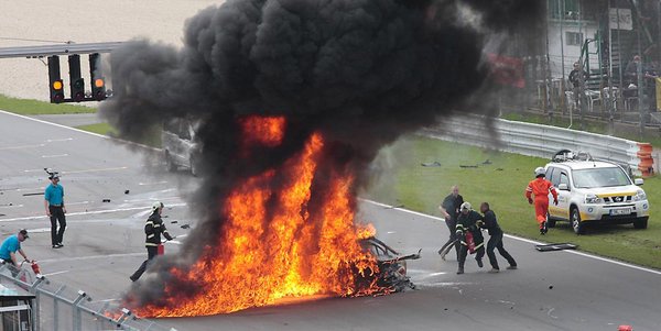Az ütközéstől a kocsi ajtaja levált, így a képeken jól látszik a tűz közepén tehetetlenül hánykolódó sofőr. A tűzoltók elég sokáig küzdöttek a lángokkal, de végül sikerült megfékezniük a tüzet és kiszedték a pilótát, aki csodával határos módon élve megúszta, de egyelőre az intenzíven van.