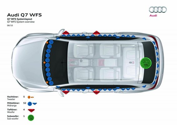 Az ötletet egy különleges mozi-hangrendszer adta: az Ilmenauban működő Linden Lichtspele a filmek hangjait 192 kis hangforrással állítja elő, így állítólag sokkal jobb térbeli hangzást lehet elérni, mint kevés hangszóróval. Az Audi a Bang & Oluffsen, a Bose és a Fraunhofer Institute segítségével dolgozta ki a rendszert, amelyhez hasonlóan komplikáltat nemigen építettek még. Öt magassugárzó, négy mélysugárzó az ajtókban, egy 12 hüvelykes mélynyomó a csomagtartóban, és 52 kis középsugárzó az utastér falában – ezekből áll a hangszóró-rendszer, amellyel a sajtóközlemény szerint minden eddiginél tökéletesebben szimulálhatók a térbeli hanghatások.