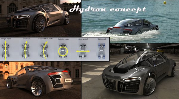 Az autó elég keskeny, hogy kevés ellenállást fejtsen ki, az ajtóit pedig úgy alakítottuk ki, hogy elvezessék a vizet. Vízben a Hydront a különlegesen kiképzett felnijei hajtják, melyeket egy-egy villanymotor forgat. Mivel a kerekek külön-külön mozognak, többféle vezetési mód közül választhatunk, s ez megkönnyíti a manőverezést vízen és parkolásnál is nagyon hasznos.