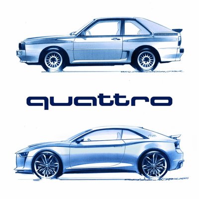 Az ős-Quattro ma már legenda: az utolsó példányai is 19 évesek, de a mai napig a legjellegzetesebb és legismertebb Audik egyike. Ráadásul az idén épp harminc éves – nem csoda, hogy a gyáriak úgy döntöttek, készítenek egy tanulmányt, amely megidézi a szellemét. Az új Quattro Concept formaterve érdekes egyvelege az aktuális Audi stílusnak és a harminc éves kupé vonásainak. A kerekek felett hullámokat vető övvonal és a tátott szájra emlékeztető hűtőmaszk ugyan az A5-ösre és az R8-asra emlékeztet, viszont a Quattro minden mai Audinál szögletesebb, és az egykori kupé ferde ablakát is megörökölte.