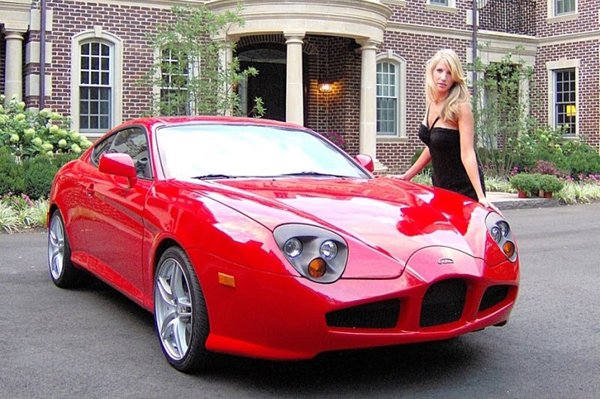 A Galatea nevű amerikai cég most a Hyundai Coupéra aggatott néhány, régimódi sportkocsikat idéző műanyag elemet, hátha valami jó sül ki a dologból. Nem kizárt persze, hogy a koreai kétajtósból lehet dögös sportkocsit faragni, de messze nem ideális alap, hiszen szerkezeti szempontból alig különbözik egy Hyundai Elantra szedántól, fronthajtású, és nem is kiugróan érdekes formatervű. De az amerikai cég elképzelése nem tűnik jónak. Sikerült teljes káoszt előidézni az autó elején: az Arnolt-Bristol hűtőmaszk eleve furcsa a modern vonalú karosszérián, a fura, három lencsét tartalmazó lámpák viszont egyik stílushoz sem passzolnak igazán.