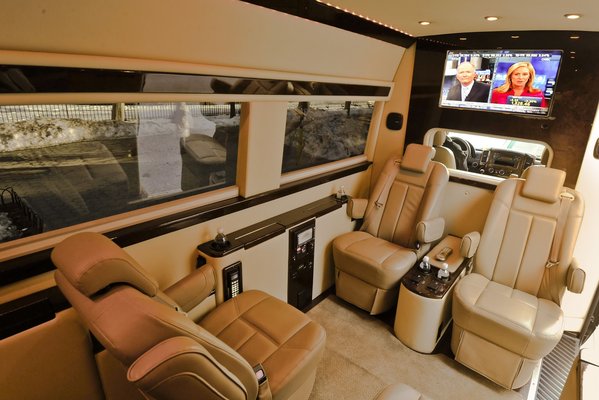 A Brilliant Van névre hallgató Sprinter belsejét teljesen átalakították. Középen négy, egymástól teljesen független szék néz egymás felé – a hátsók mögé betettek egy plusz üléssort, így összesen hét személy szállítására képes a Merci.