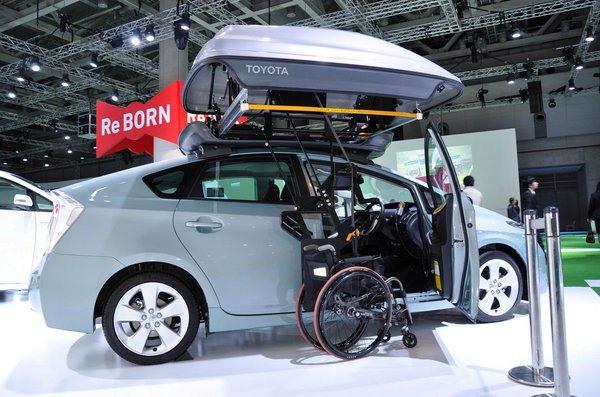 A Toyotának a konnektorból töltős Prius, a zsugorított Prius (Aqua), a dögös Prius (GS) után még maradt puskapora: akadt egy kerekesszékeseket fogadó spéci verzió is belőle. Emberünk odagurul, átül, a kocsiját pedig a Prius a sínen kicsúsztatott tetőbokszba emeli. Zseniális.