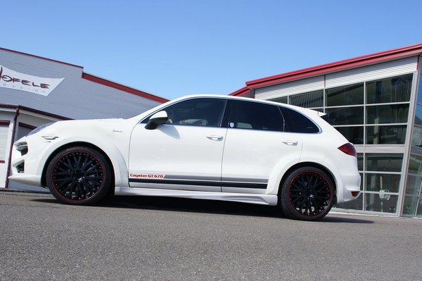 Ami elsőként szemet szúr, az a 14 részes optikai tuningkészlet. Sárvédő-szélesítésekkel, nyílásokkal tarkított motorháztetővel, küszöb- és sárvédő-toldatokkal, tetőspoilerrel és a gyáritól igencsak eltérő frontkiképzéssel igyekeztek feldobni a Cayenne alapból elég semmilyen formatervét. Ez utóbbi része a gigantikus bajuszpamacsot formázó első légbeömlő, amelyhez hasonló méretűvel eddig nemigen találkoztunk. Ahhoz persze, hogy teljes legyen a kép, kellenek még a 20 vagy 22 hüvelykes felnik, amelyek teljesen kitöltik a szélesített sárvédőíveket.