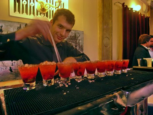 De legalább lehet tanulmányozni a cirill betűvel fonetikusan kiírt nemzetközi neveket, a Macdonalds-ot, a Raiffeisenbankot, az otp bankot, vagy a fitnesz centert (utóbbit a Kőbájkernek lőttem). Gyors átöltözés következett a szállodában, majd egy nagy busszal bevittek minket a belvárosba, ami egyébként lenyűgöző, szép és igényes. Óriási rongyrázás vette kezdetét, a koktélokat két, jégből készült bárpulton készítették, és itt láttam először, hogy nyírfakéreg-sziruppal készítenek bármit is. Megvan, ez a Xilit, méregdrága, öt szénhidrogén-atomos cukor (nem hat), nem hizlal, cukorbetegek is ehetik. Az egyetlen, ami elfogadható.