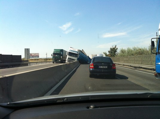 Percekkel ezelőtt még maga az autópálya-kezelő sem ismerte a torlódás okát – mi azonban egy véletlen folytán hozzájutottunk néhány képhez a helyszínről. A látvány nem mindennapi: a szállítmány válószínűleg egy hevesebb manőver közben elszabadult, és magával rántva a pótkocsit ponyvástúl átesett a két útpályát elválasztó betonkorláton. Mindez a Dunaharaszti lehajtó előtt mintegy 2 kilométerrel történt, és úgy tűnik, mivel az AÁK-nak nincsenek ekkora jármű elvontatására alkalmas gépei a helyszín közelében, a műszaki mentés, és vele a dugó még órákig eltarthat.