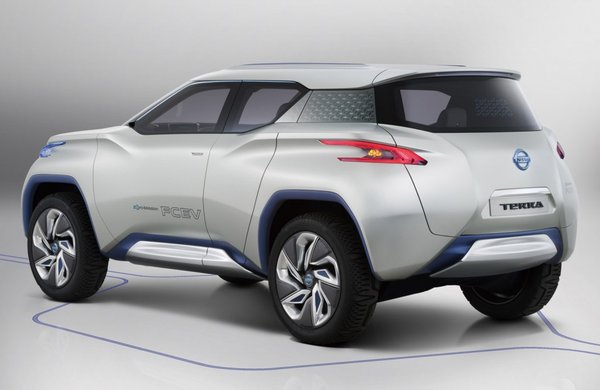 A Terra azonban nem csak formai szempontból formabontó. A hajtását hidrogén táplálta üzemanyagcellával oldották meg, azaz az autót villanymotorok mozgatják, és közben csupán vízpára távozik a járműből, ami így tiszta üzemű, mégis jóval nagyobb hatótávolságot érhet el, mint egy hagyományos villanyautó. A megoldás legnagyobb hátrányát egyelőre a Nissan sem tudta kiküszöbölni – az üzemanyagcellába egész kis vagyont érő platinát kell beépíteni – így szériamodellben aligha látjuk viszont, de jó hallani, hogy a Nissannál sem adták fel a fejlesztést most, hogy az üzemanyagcellás hajtást már nem akkora divat mutogatni, mint tíz évvel ezelőtt.
