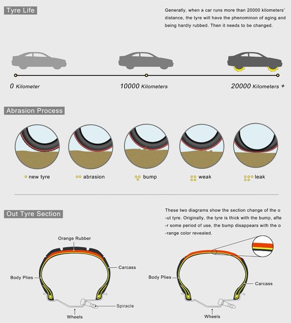 Erre kínál egyszerű megoldást két kínai formatervező ötlete: Gao Feng Lin és Zhou Bu Yi igazából annyira egyszerűen oldották meg a kérdést, amennyire ez csak lehetséges. Úgy képzelik, ha a gyártó a profil alá narancsvörös – vagy más, feltűnő színű – gumiréteget helyezne, az abroncson az előre meghatározott kopás elérése után kilátszanának a színes részek – ezzel jelezve, hogy az abroncsot illene lecserélni. A gumigyár így pontosan jelezhetné a felhasználók felé, hogy mennyi kopást tart még biztonságosnak az adott gumikeverék és mintázat mellett, a feltűnő szín pedig ösztönözné az autósokat, hogy időben cseréljenek abroncsot.