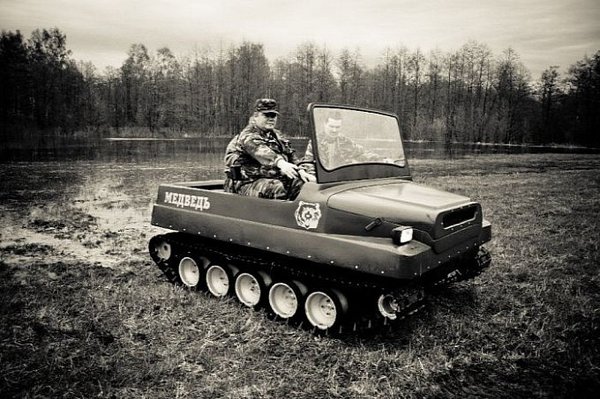 Nagyon sokat nem tudunk a Medvegy, azaz medve elnevezésű gépről, csak annyit, hogy a primitív műanyag karosszéria alatt ladik-szerű csónaktest lapul, azaz nem csak szárazföldön, de vízben is képes haladni. A lánctalpas futómű révén pedig laza talajon is egész jól boldogul. Valószínűleg épített úton a legügyetlenebb, bár az útfelületben a gumibevonatú lánctalpak aligha tesznek komoly kárt. A hajtás egy az egyben került át a Ladából, a 76 lóerős, karburátoros, 1,5 literes motorral a 2,75 méter hosszú, ötszemélyes jármű maximum 50 km/h-val képes haladni.