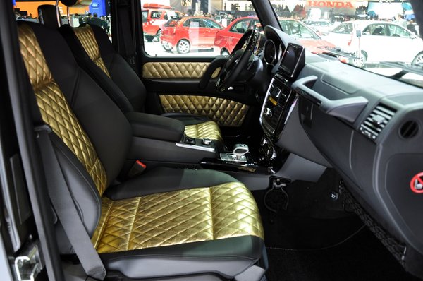 A beltér átváltozott, valami teljesen új az, amivel vásárlóink szembesülnek odabent. Na, ebben legalább igazuk van. Ritkán szembesül az ember arany bőrrel, majrévassal és 280-ig skálázott sebmérővel egy G Mercedesben. Mindezek után a három differenciálművet záró eloxált alumínium-kapcsolósor legalább olyan idegenül hat, mint Hells Angels-bulin a Száztagú Cigányzenekar. Mindezt leszámítva nem látunk mást odabent, mint egy öregecske Mercedes-belteret túl sok kapcsolóval, kristály kormánnyal nyakonöntve némi arannyal. Mondjuk az vicces, mennyire nincs lábtér egy ekkora batárban, de erről valószínűleg az irdatlanul vaskos üléstámlák és a beléjük integrált hangrendszer is tehet, mely egyben masszázsfunkciót is ellát. A HD-felbontású monitorok természetesek, ahogy a dupla tetőablak is. Düböröghet az I'm too sexy.