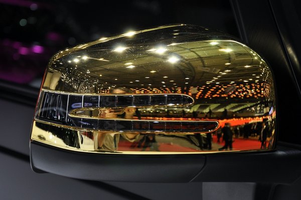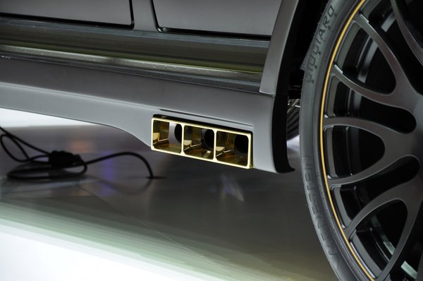 Az új, sportos kinézet a teljesen egyedi gyártású és átalakított elemeknek köszönhető. Kedves olvasó, ha ön – a képeket nézve – úgy gondolja, hogy egy G-Mercedes kinézete sportos, akkor sürgősen keresse fel szemorvosát. Hogy mégis, miért kéne ezt gondolnia? Elsősorban ott vannak a tükrök. Szénszálas műanyagok, aranyszínben, iszonyatosan oda nem illő integrált indexekkel.