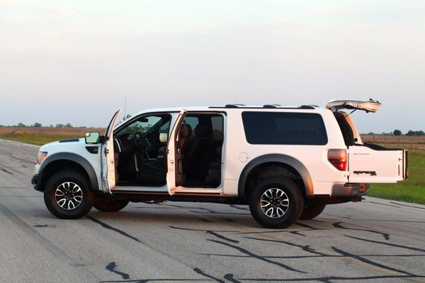 Az F-150 SVT Raptor volt az alap, amely a Ford legsportosabb platós modellje. Gyári kivitelben is több mint négyszáz lóerős, és 7,5 másodperc alatt gyorsul 100 km/h-ra. Ezt hozták össze az F-150 sorozat leghosszabb kivitelével, és hátul a plató rovására meghosszabbították az utasteret is. Így nyolcan bőségesen elférnek belül a három üléssorban, és ők mind élvezhetik a nagyobb kerekek, a terepfutómű, a Brembo fékek és a Hennessey tuningolta 6,2 literes, 600 lóerős V8-as elképesztő erejét. A VelociRaptor SUV nevű alvázas dög állítólag 6 másodperc alatt eléri a 100 km/h-t, és erre jó eséllyel mindenféle terepviszonyok között alkalmasnak tűnik.
